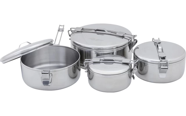 Unsere Edelstahltöpfe halten häufige Nutzung aus und stellen eine hochwertige, strapazierfähige Kochgeschirroption dar. Sie sind ideal für Pfadfinder und Campinganfänger sowie Reisende unter Sparzwang geeignet.