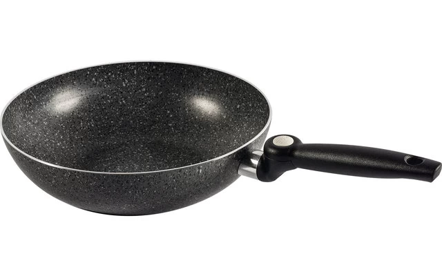 Aluminium Pfanne in Granitoptik. Innen mit hochwertiger Antihaftbeschichtung. Besonders platzsparend durch den klappbaren Griff.