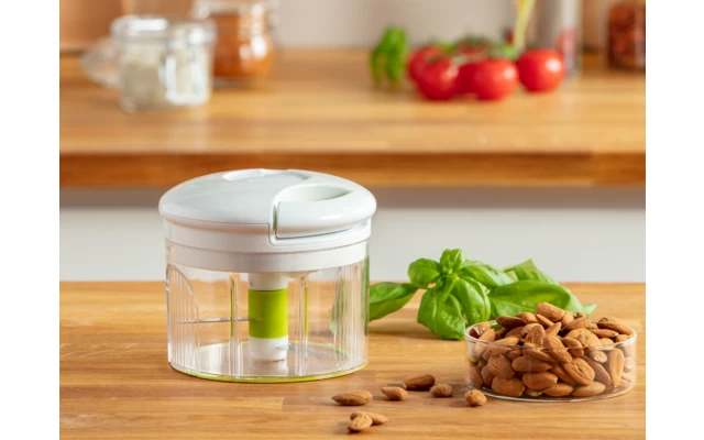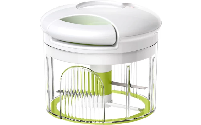 Mit dem Turboline Kräuter- und Gemüseschneider können Sie fast alle Arten von Zutaten schnell und effizient zerkleinern, indem Sie einfach am Griff ziehen! Das patentierte System ist mit schwenkbaren