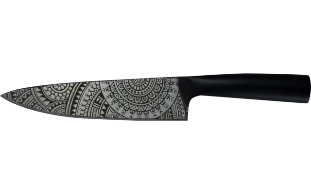 Gute, robuste Messer sind für den bekannten Tattoo Artist Henk Schiffmacher kein Neuland. Dieses Kochmesser ist aus einem Stück massivem deutschen Edelstahl gefertigt und mit einer speziellen Eisenoxidbehandlung geschwärzt. Und es wäre kein Messer von Schiffmacher ohne Tätowierung, oder? “Genau wie der Mensch hat auch das Messer eine Seele. Dieses polynesisch inspirierte Design verkörpert diese Seele und gibt ihr Kraft”.