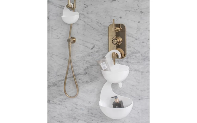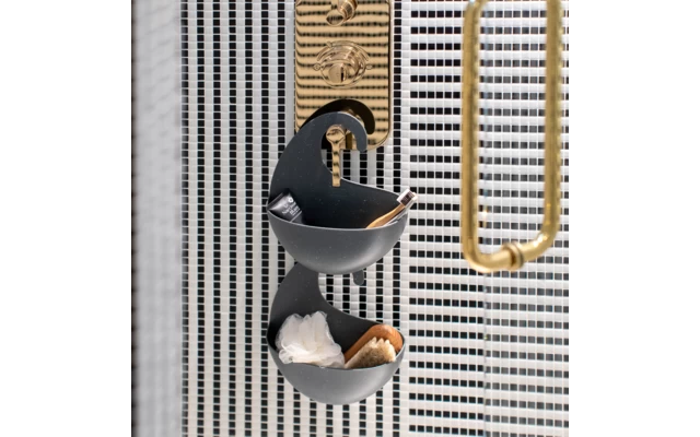 Mit seinem schwungvollen Haken lässt sich SURF M an die Armatur von Badewanne oder Dusche hängen. Doppelt trickreich sind die Schlitze an der Unterseite: hier kann das Wasser ablaufen und zudem ein weiteres SURF Utensilo angekoppelt werden. Viel Platz für Shampoo, Duschgel und mehr. SURF M besteht zu 100% aus recyceltem Kunststoff sowie Zellulose und spart damit mehr als zwei Drittel CO2 im Vergleich zu neuen Materialien ein.