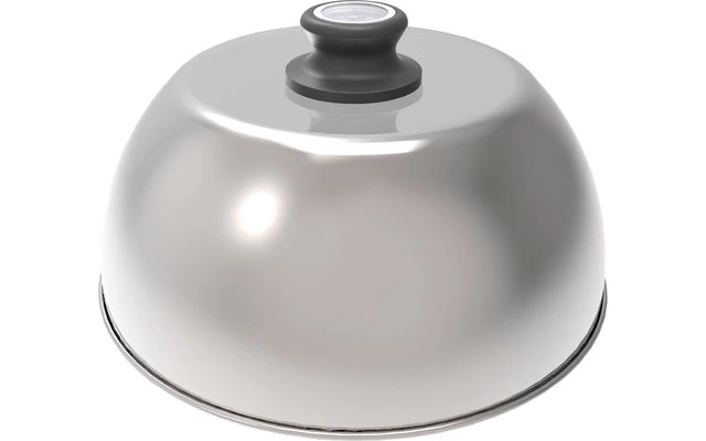 Mit der Reisehaube aus Edelstahl eignet sich der LotusGrill auch zum Braten, Garen, Backen oder Schmoren. Über das integrierte Thermometer lässt sich die Temperatur ablesen und über den Lüfter regulieren. Nach dem Abmontieren des Thermometers wird diese unter der Innenschüssel verstaut und benötigt keinen extra Raum.