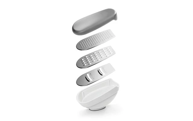 - Mit 3 verschiedenen, wechselbaren Reiben