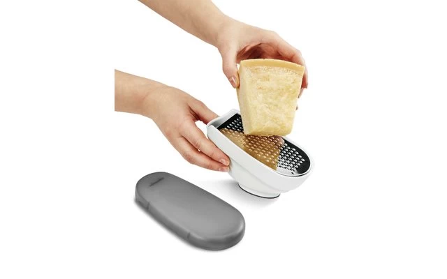 Trio-Box Reibe mit Behälter und Deckel. Mit 3 verschiedenen, wechselbaren Reiben. Behälter mit Antislip-Boden und Deckel. Auch für die Aufbewahrung von Lebensmitteln geeignet.