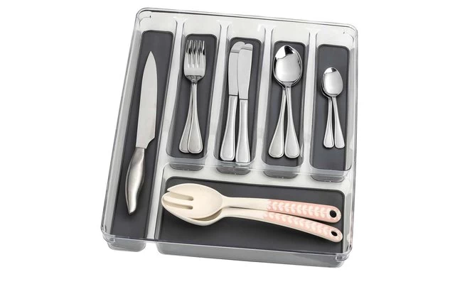 - Fünf Besteckfächer für getrennte Aufbewahrung von Messern, Gabeln, Löffeln, Teelöffeln oder Küchenmessern