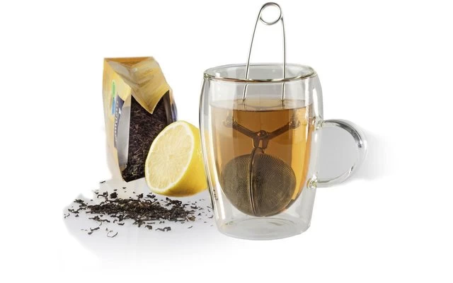 Modernes Klappsieb mit Federklappmechanismus. Für das Aufbrühen von losem Tee oder Gewürzen in Tassen, Kannen, Töpfen, etc.